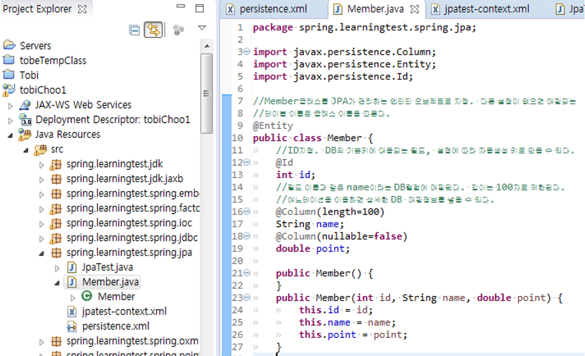 109. PersistenceUnit : 스프링의 DI방식 대신 JPA 표준 스펙에 나온 방식.(EJB와 비슷). 이 애노테이션을 사용하면 EntityManagerFactory를 주입받는 코드를 만들 수 있다. 이렇게 하면 스프링프레임워크에 대한 의존도가 전혀 없는 순수한 JPA 코드가 된다. (아래 스샷참조)
