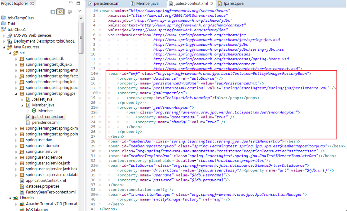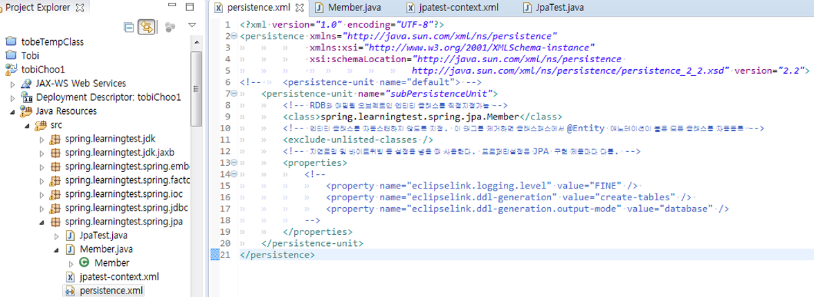21. JPA 참조구현으로 만들어진 EclipseLink 2.0 사용. jpaVendorAdapter