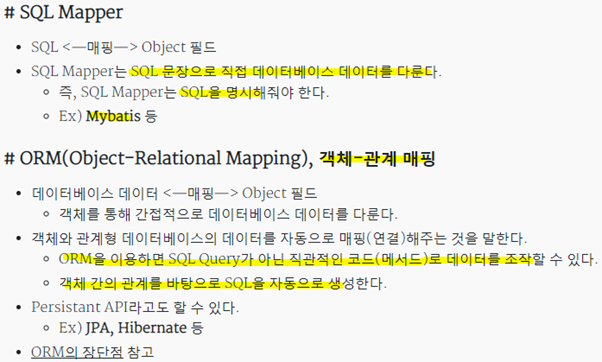 * 관계형 DB는 성능이 매우 뛰어난 기술임에는 분명하지만 오브젝트를 중심으로 개발하는 자바 오브젝트와 텍스트 문장인 SQL을 직접 작성하고 파라미터를 바인딩해야 하는 부분이 번거롭다.
