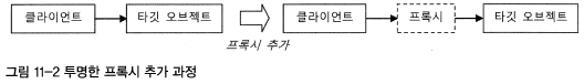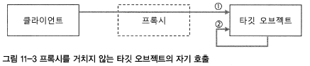 (1)은 클라이언트에서 프록시를 통해 들어온 호출이므로 당연히 프록시의 기능이 동작한다. 하지만 (2)의 경우 타깃 오브젝트 안에서의 호출이므로 프록시를 통하지 않고 직접 타깃 오브젝트 안에서의 호출이므로 프록시를 통하지 않고 직접 타깃 오브젝트의 메소드 호출이 일어난다.(데코레이터 패턴을 기억해보면 타깃클래스가 아닌 프록시 클래스를 호출하는 것과 같은 원리)