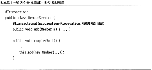 > 문제는 complexWork()에서 add() 메소드를 호출할 때 프록시를 이미 지나서 MemberSerivce 빈의 오브젝트로 들어왔으므로 트랜잭션 프록시를 다시 거치지 않고 add() 메소드가 바로 실행된다.