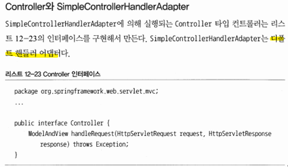 > DispatcherServlet은 여러 개의 핸들러 매핑에 의해 사용할 컨트롤러 빈을 찾아주면 그에 맞는 핸들러 어댑터를 이용해 컨트롤러를 호출해주는 것이다.