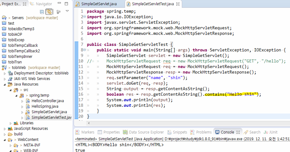 스프링의 Mock은 JSP로 포워딩하는 경우 JSP 서블릿을 호출해 그 결과를 전부 가져오는 것은 불가능하다. 데이터를 검증하는데 주로 쓰임.