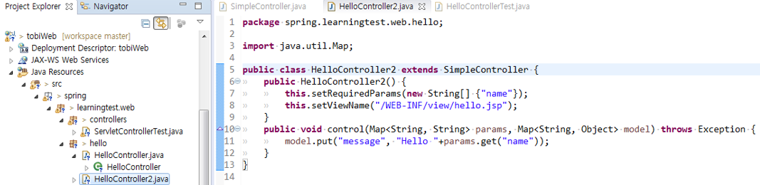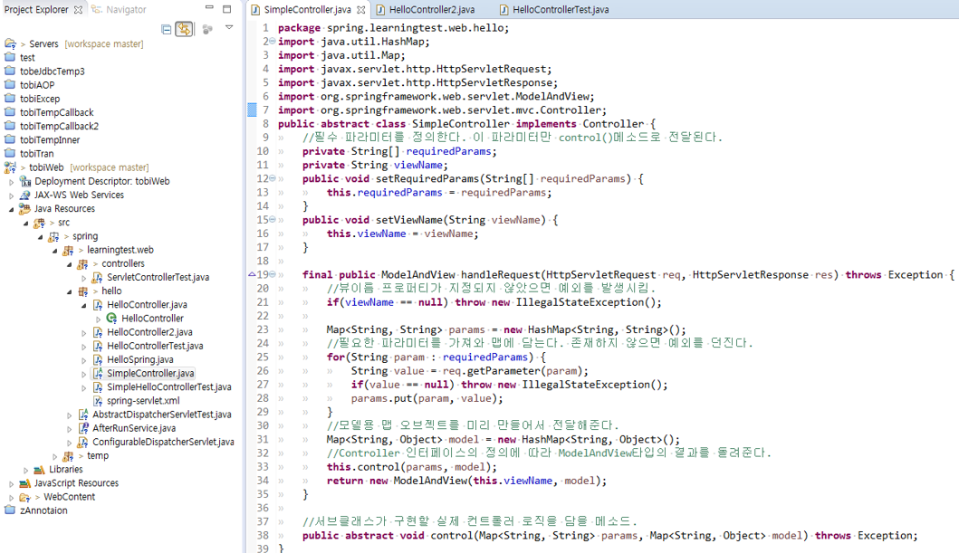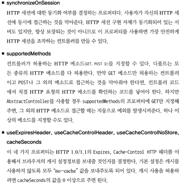 > 하지만 권장하지 않는다. 웹브라우저를 클라이언트로 갖는 컨트롤러로서의 필수 기능이 구현되어 있는 AbstractController를 상속해서 컨트롤러를 만드는게 편리하기 때문이다. 물론 AbstractController를 상속해서 컨트롤러를 만드는게 편리하기 때문. 물론 AbstractController는 Controller인터페이스를 구현한 Controller를 구현한 Controller타입의 컨트롤러이다.
