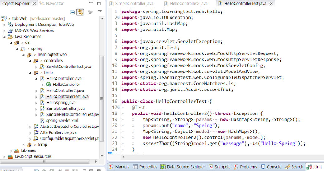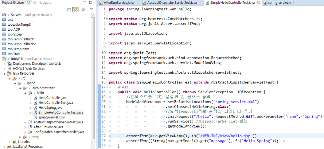 25. Servlet 타입의 컨트롤러는 모델과 뷰를 리턴하지 않는다. 또한, DispatcherServlet은 모델앤뷰 타입의 오브젝트 대신 null을 리턴하면 뷰를 호출하는 과정을 생략하고 뷰 호출을 하지 않는다. 서블릿 컨트롤러처럼 직접 HttpServletResponse에 결과를 넣는 컨트롤러도 있기 때문에 위와같이 테스트함.