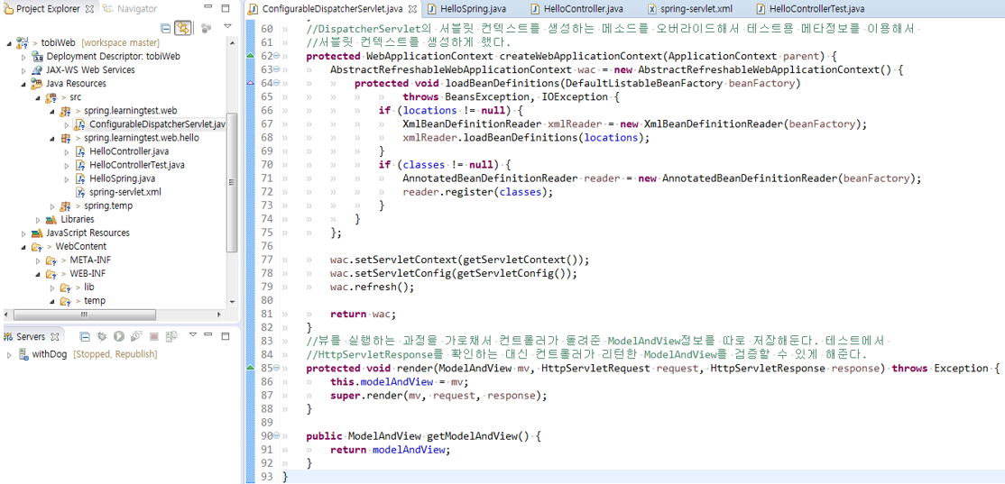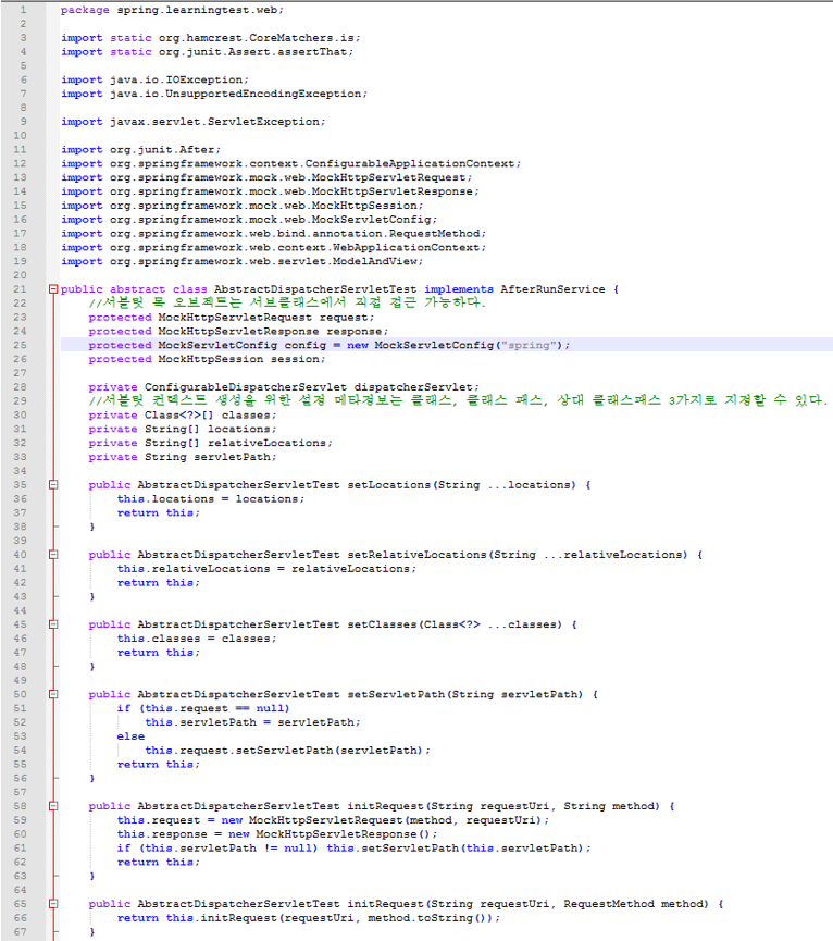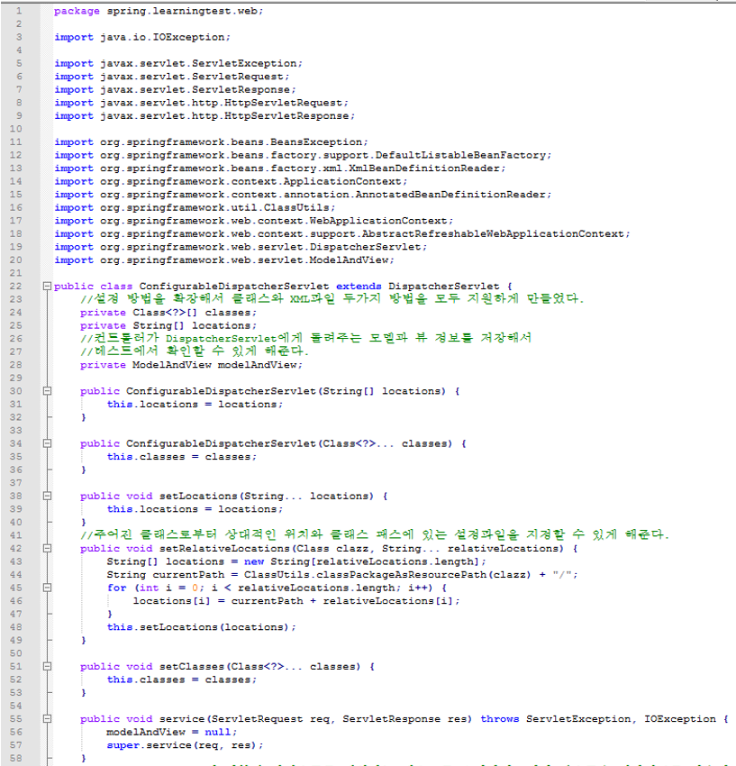 * 디스패처 서블릿은 초기화 할 수 있도록 ~~servlet.xml을 가진 설정파일을 준비해줘야하고, 매번 전략을 다르게 구성하기 위해 설정을 다르게 준비하는 일만해도 간단하지 않다. 아래설명은 디스패처 서블릿을 확장해서 간단하게 테스트하기 위한 확장 클래스이다.