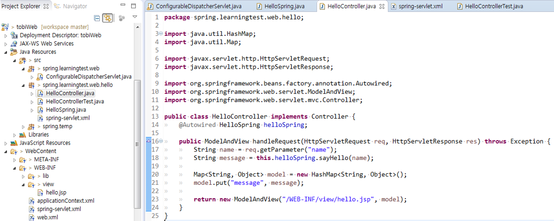 23. HelloServlet은 29라인에 내부클래스와 SimpleServletHandlerAdapter 등록. 원래는 아래스샷처럼 등록해야줘야함.