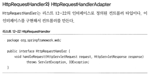 서블릿 인터페이스와 비슷하다. 실제로 HttpRequestHandler는 서블릿처럼 동작하는 컨트롤러를 만들기 위해 사용한다. 전형적인 서블릿 스펙을 준수할 필요없이 HTTP 프로토콜을 기반으로 한 전용 서비스를 만들려고 할 때 사용할 수 있다.