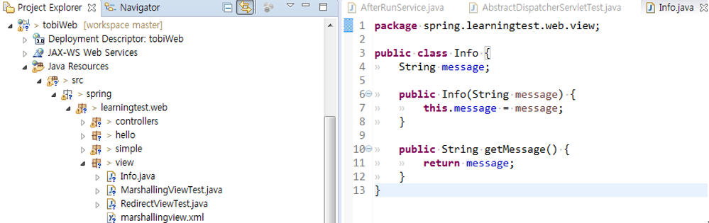 34. 컨트롤러에서 준비한 모델은 DispatcherServlet에 의해 helloMarshallingView 오브젝트로 전달될 것이다. 모델에서 info 오브젝트를 꺼내서 DI 받은 마샬러로 XML을 생성해준다.
