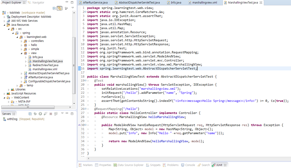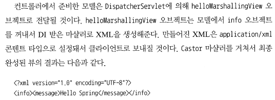 34. 컨트롤러에서 준비한 모델은 DispatcherServlet에 의해 helloMarshallingView 오브젝트로 전달될 것이다. 모델에서 info 오브젝트를 꺼내서 DI 받은 마샬러로 XML을 생성해준다.