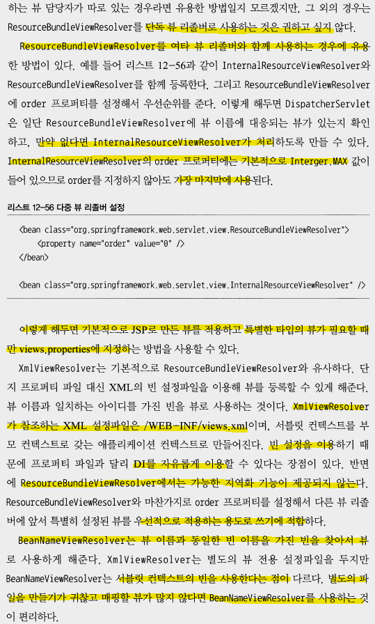 뷰 리졸버는 핸들러 매핑이 URL로부터 컨트롤러를 찾아주는 것처럼, 뷰이름으로부터 사용할 뷰 오브젝트(디폴트 InternalResourceView, JstlView)를 찾아준다. 뷰 리졸버를 빈으로 등록하지 않았다면 DispatcherServlet의 디폴트 뷰리졸버인 InternalResourceViewResolver가 사용됨. 핸들러 매핑과 마찬가지로 뷰리졸버는 하나 이상 빈으로 등록할 수 있는데, 이때는 order 프로퍼티를 이용해서 순서를 지정해주는 것이 좋다.