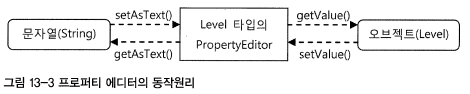* 위처럼 프로퍼티 에디터는 매번 새로만든다. 싱글톤 빈으로 등록될 수 없다. 프로퍼티 에디터에 setValue()를 이용해 오브젝트를 넣은 후 getAsText()로 변환된 문자열을 가져오는 식이다. 프로퍼티 에디터에 의해 타입이 변경되는 오브젝트는 상태를 갖고 있기 때문에 싱글톤은 안된다.