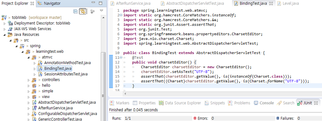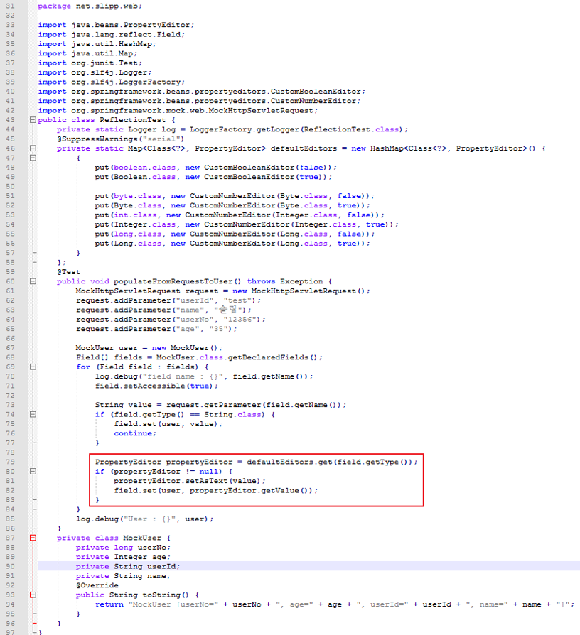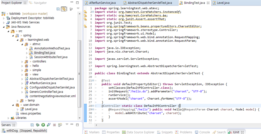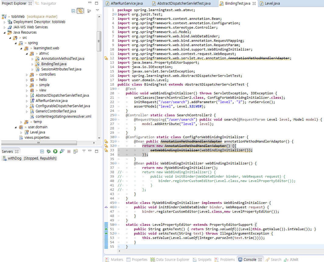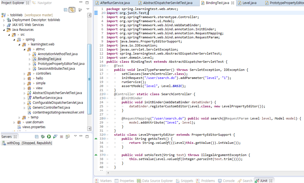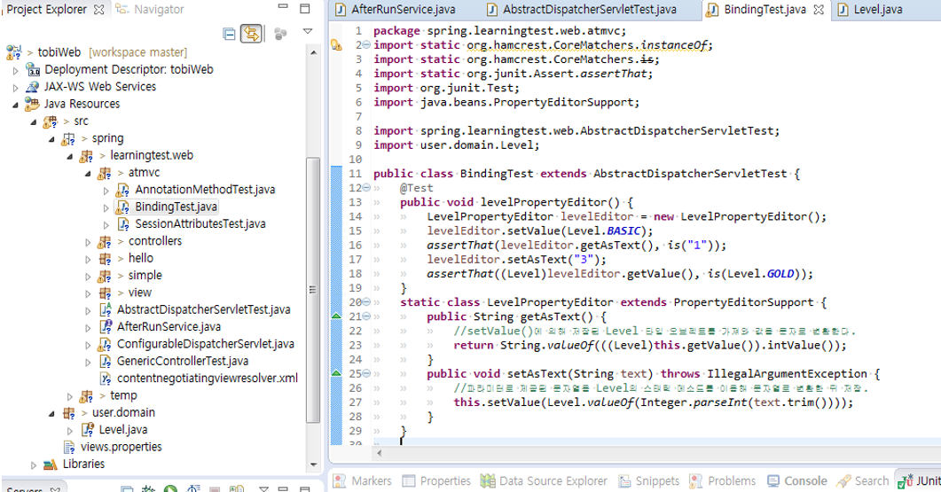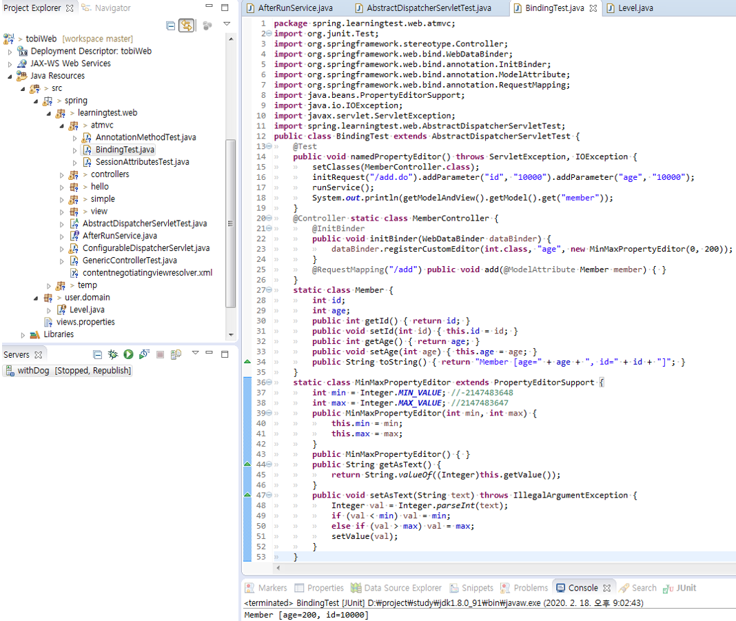 23~31. WebDataBinder 테스트. 바인더 오브젝트를 만들고 추가로 프로퍼티 에디터를 등록해주면 타입변환 메소드를 이용할 수 있다. 물론 코드에서 직접 만들어 수동으로 바인딩할 필요는 없다. @InitBinder가 붙은 메소드를 적절히 이용해서 추가해주는 것은 개발자의 몫이다. 메소드 애노테이션타입 변환을 위해 유연한 사고가 필요하다.