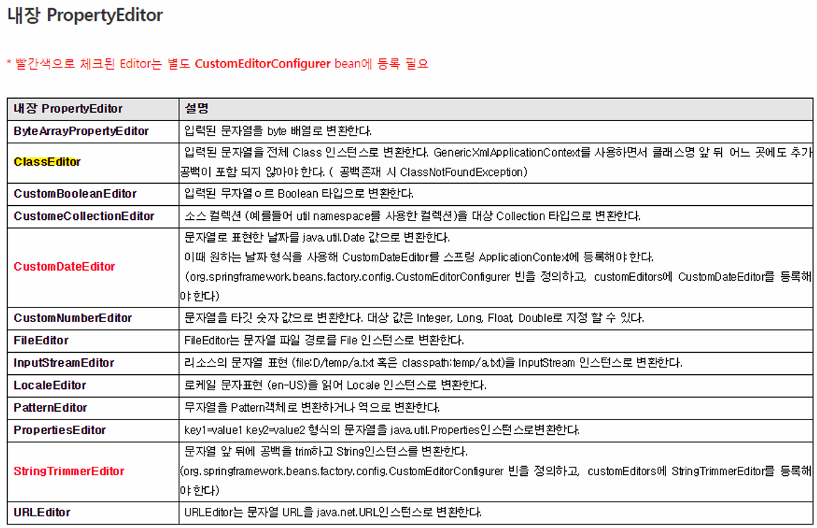 > 자바빈은 원래 GUI 컴포넌트를 만들 때 활용하도록 설계됐다. 위처럼 문자열을 입력하는 것만으로 다양한 타입으로 변환 기능을 하게했다. GUI컴포넌트로 자바빈은 성공하지 못해 getter, setter 역할의 자바빈 형태가 남았지만, 스프링은 스프링 PropertyEditor를 통해 XML <property value=””>를 통해 프로퍼티 값을 실제 오브젝트로 활용될 수 있게 했다.
