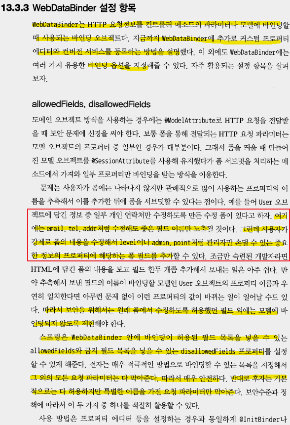 25. AllowedField : id 외에는 HTTP 요청 파라미터에는 사용하지 못하도록 지정. 필드 이름은 *name, tel*, *type*처럼 와일드카드를 이용해 지정할 수도 있다.