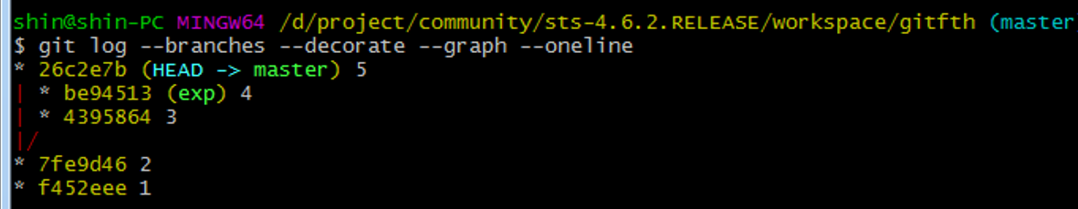> exp 에서 작업한 4번과, master에서 작업한 3,5번을 부모로 갖는다. 즉 4번이 마지막 exp 커밋 파일 5번이 없다.