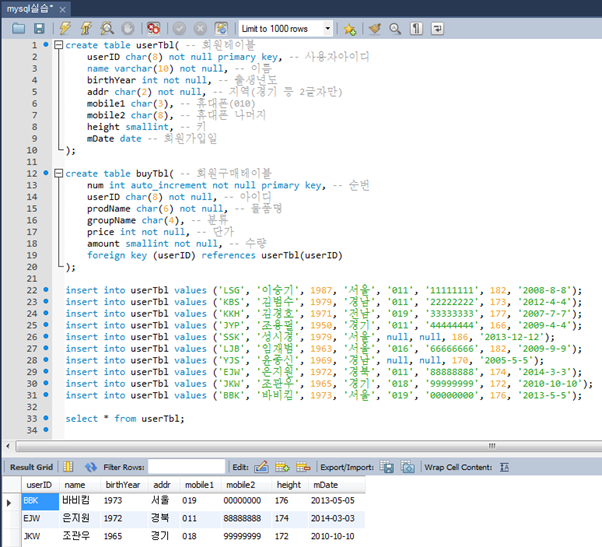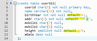 12. Default : insert시 birthYear를 입력하지 않으면 -1이 기본적으로 셋팅된다.