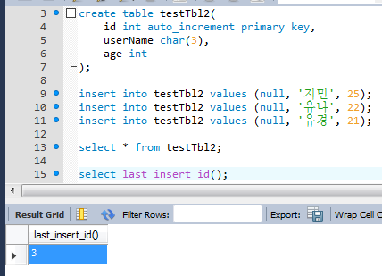 15. Select last_insert_id() : auto_increment를 통해 마지막에 입력된 값을 보여준다.