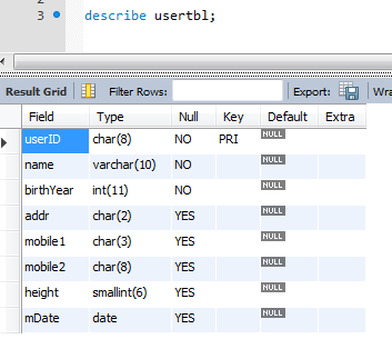 4. auto_increment : 지정할 때는 꼭 primary key 또는 unique로 지정해 줘야하고, insert문에서 null 값을 지정하면 자동으로 값이 입력된다.