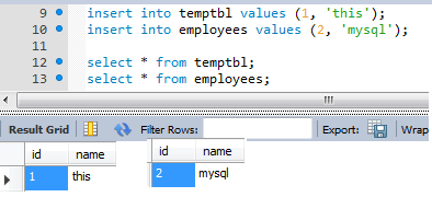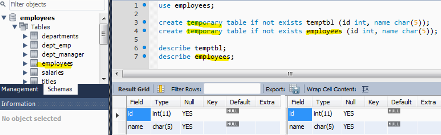 3~4. Temporary table 임시테이블 생성. Temptbl은 원래 없는 테이블이니 당연히 생성되고, employees는 기존 테이블을 무시하고 임시테이블을 생성한다.