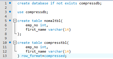하나는 정상적인 테이블, 하나는 row_format=compressed를 붙여 압축되도록 설정