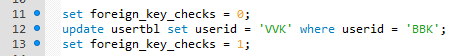 BBK아이디가 구매테이블에 구매한 기록이 있어 foreignkey 제약 조건에 의해 데이터가 변경되지 않을 시 제약조건 비활성화하여 수정 가능.