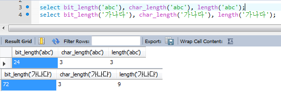 * bit_length(문자열), char_length(문자열), length(문자열)