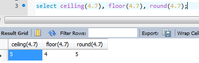* ceiling(숫자), floor(숫자), round(숫자) : 올림, 내림, 반올림을 계산한다.
