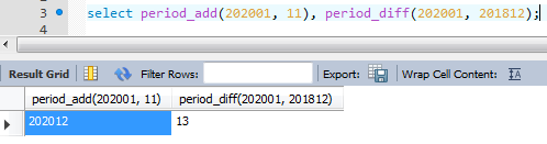 * period_add(연월, 개월수) : 연월에서 개월만큼의 개월이 지난 연월을 구한다. 연월은 YYYY 또는 YYYYMM 형식을 사용한다.