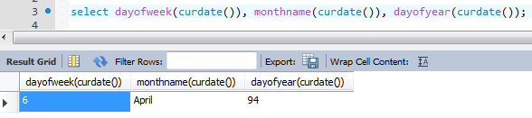 * dayofweek(날짜), monthname(날짜), dayofyear(날짜) : 현재요일(1:일, 2:월, ~ 7:토), 월 이름, 1년 중 몇 일이 지났는지를 반환한다.