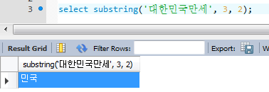 * substring(문자열, 시작위치, 길이) 또는 substring(문자열 from 시작위치 for 길이)