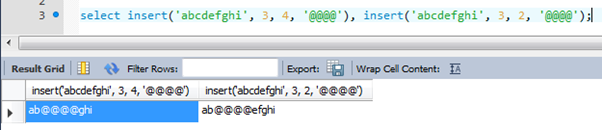 * insert(기준 문자열, 위치, 길이, 삽입할 문자열) : 문자열의 위치부터 길이만큼을 지우고 삽입할 문자열을 끼워 넣는다.