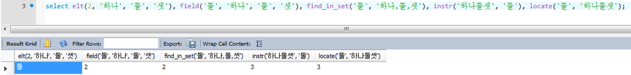 3. find_in_set(찾을 문자열, 문자열 리스트) : 찾을 문자열을 리스트에서 찾아 반환. 리스트는 ,로 구분되어 있어야함.