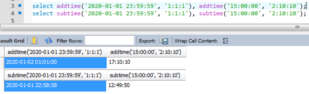 * addtime(날짜/시간, 시간), subtime(날짜/시간, 시간) : 날짜/시간을 기준으로 시간을 더하거나 뺀 결과를 구한다.