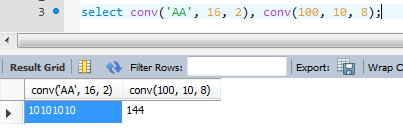 * conv(숫자, 원래 진수, 변환할 진수) : 숫자를 원래 진수에서 변환할 진수로 계산한다. 16진수 AA를 2진수로 변환. 10진수 100을 8진수로 변환