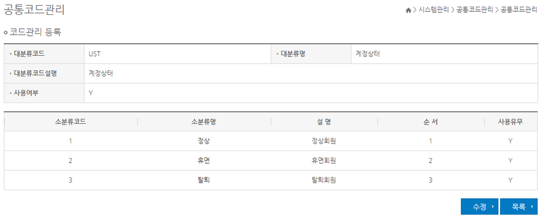 나사장의 부하직원들 즉 대분류 코드의 소분류 코드정보를 저장하고 조회가 가능하다.