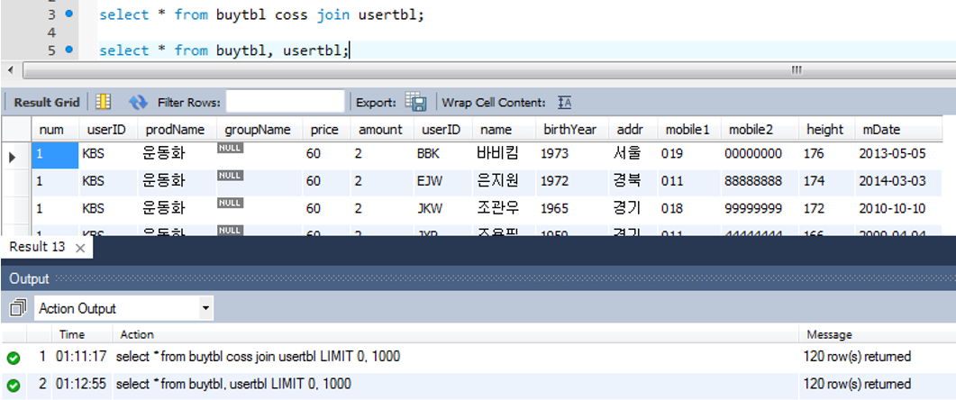 따라서 회원테이블 10명과 구매테이블 개수인 12개가 곱해져 120개의 결과가 된다.