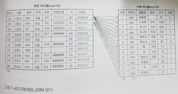 Buytbl은 12개의 데이터 모두 아이디를 가지고 있다. Usertbl 10개의 데이터. 한번도 구매하지 않은 이승기, 김경호, 임재범, 윤종신, 조관우는 구매테이블에 없다.