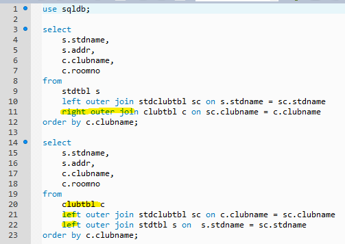 위 2개의 조인한 쿼리는 같다. 11라인의 마지막 right outer join을 따라가 마지막 동아리(clubtbl)을 기준으로 조회한다.