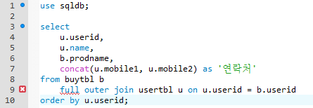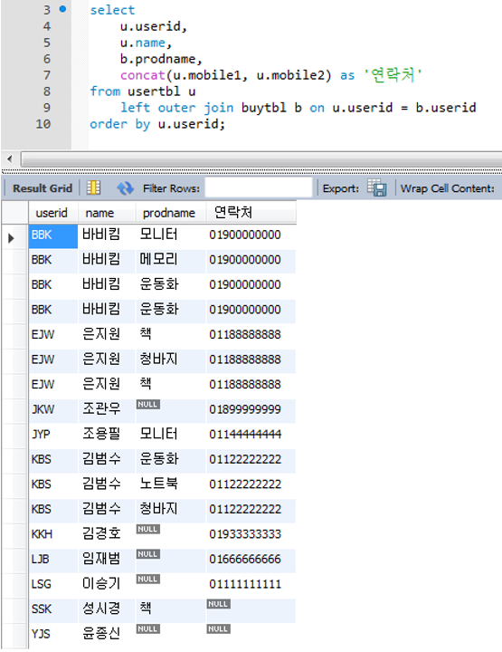 9. left outer join : 왼쪽테이블(usertbl)의 것은 모두 출력한다. 즉, 구매기록이 없는 전체 회원 정보를 보고 싶을 때. 줄여서 left join 이라고만 써도 된다.