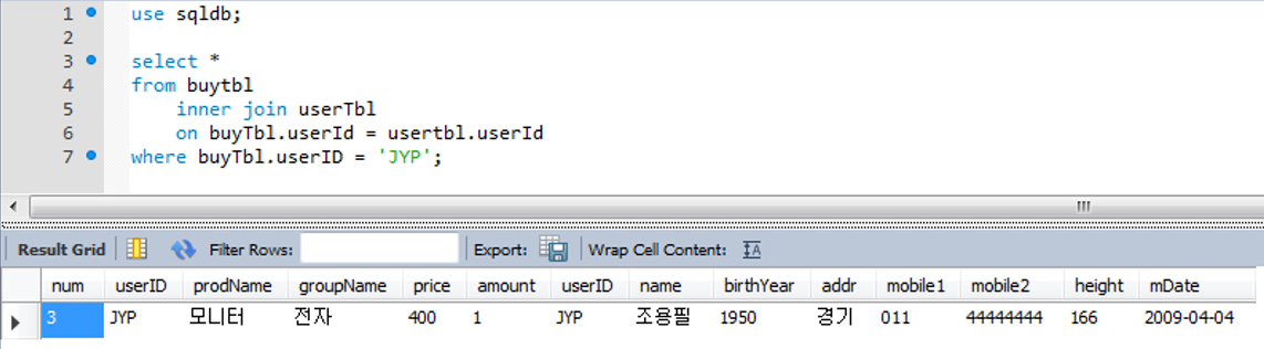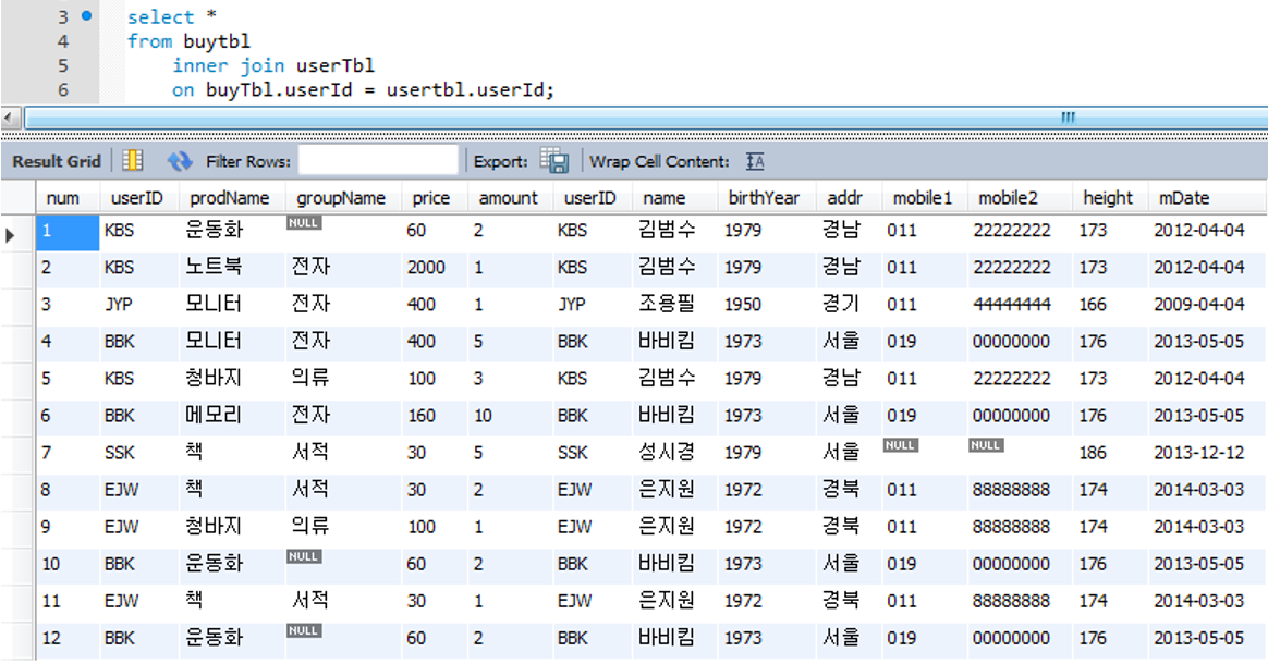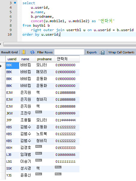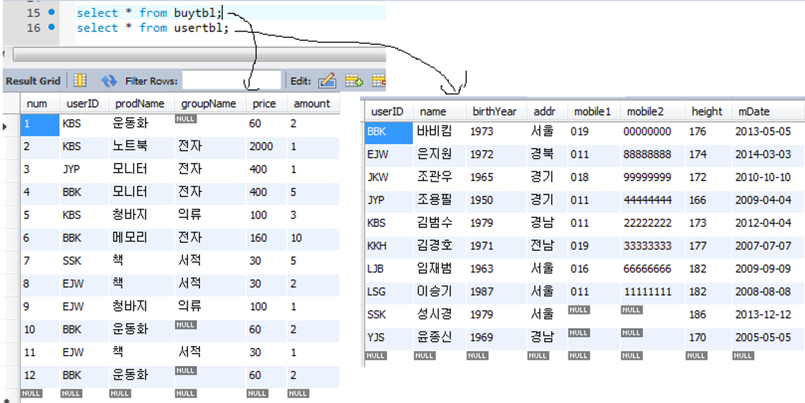 Buytbl은 12개의 데이터 모두 아이디를 가지고 있다. Usertbl 10개의 데이터. 한번도 구매하지 않은 이승기, 김경호, 임재범, 윤종신, 조관우는 구매테이블에 없다.