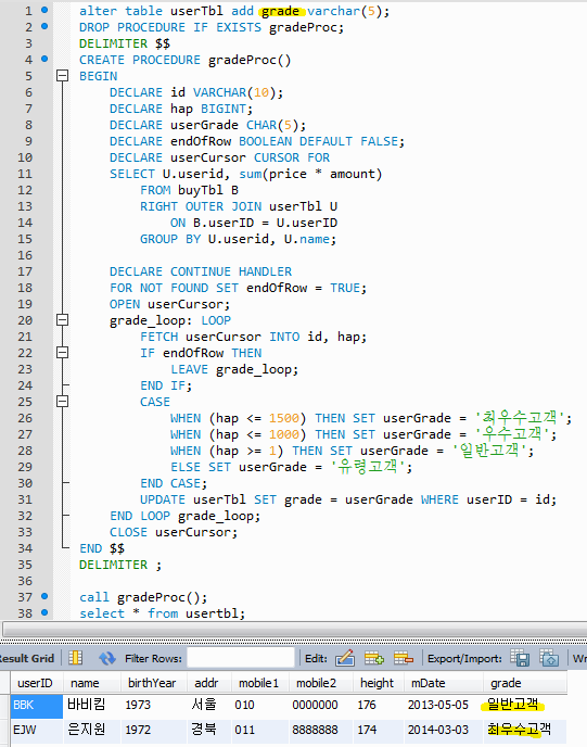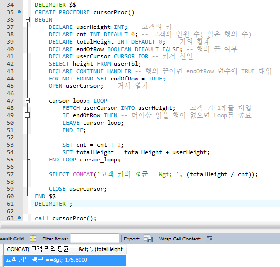 고객의 평균키를 구하는 프로시저. AVG 함수가 더 적절하지만, 홀수의 평균값이나 5의 매수에 해당하는 값의 평균 등 특별한 경우 커서는 사용된다.