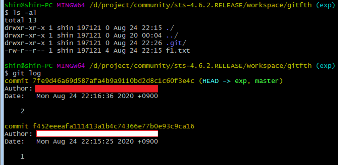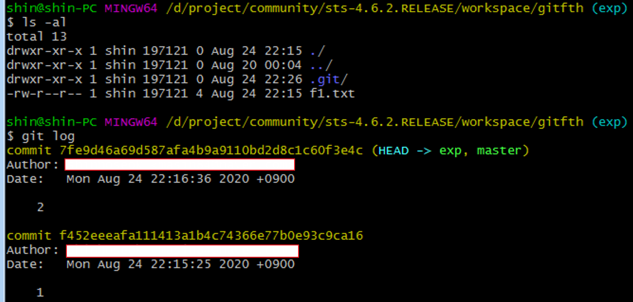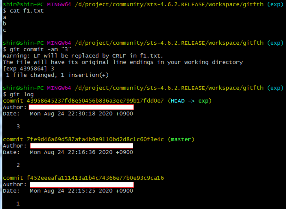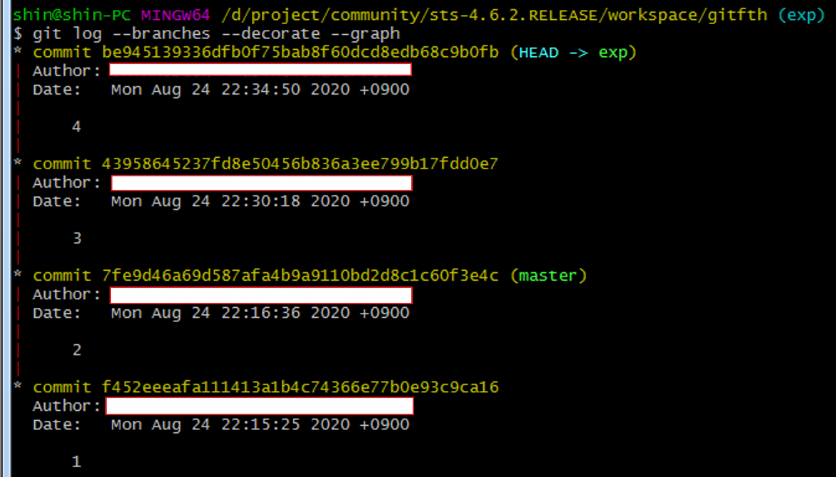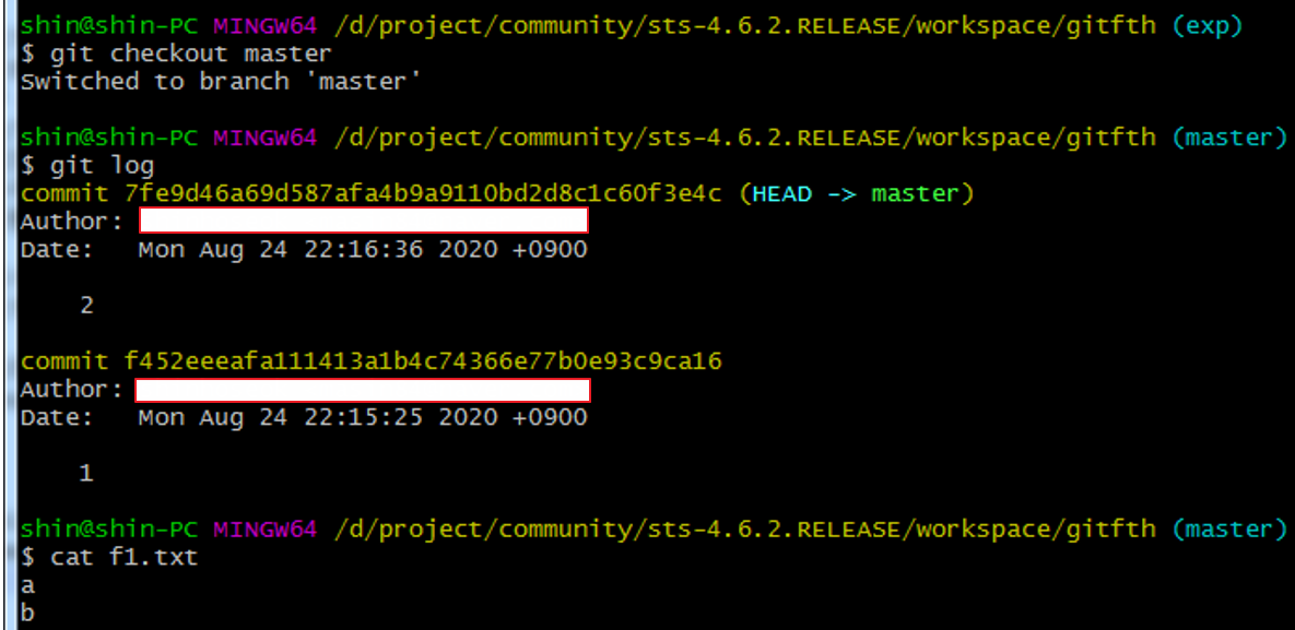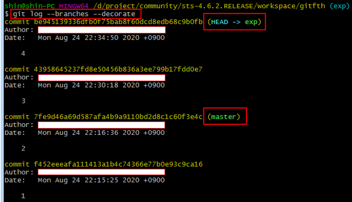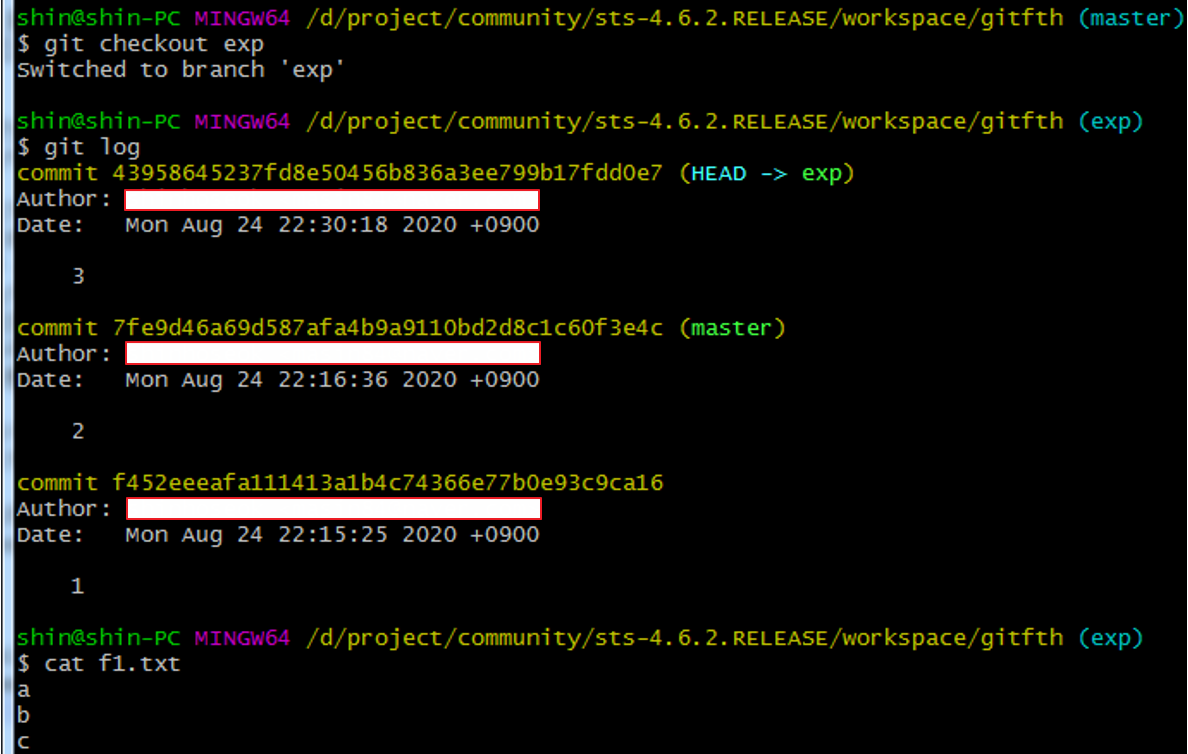 git log로 히스토리를 보면 master와 exp 브랜치는 같은 상태라는 것을 알 수 있다.