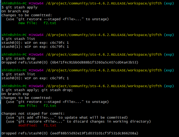 5. 2번째로 임시저장한 것을 현재 소스에 적용하고 stash drop