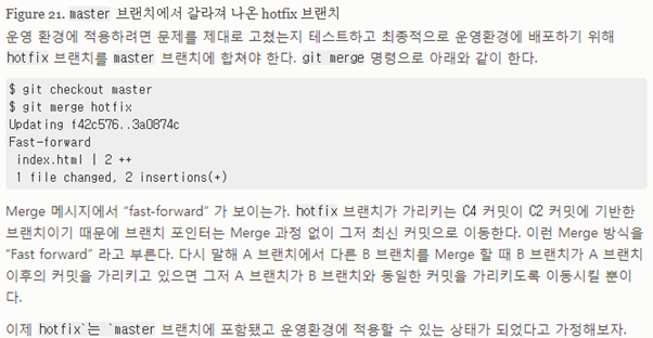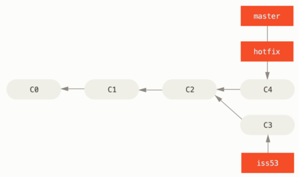 > master 브랜치가 가르키는 commit을 hotfix가 가르키는 commit으로 빨리감기를 한다는 의미