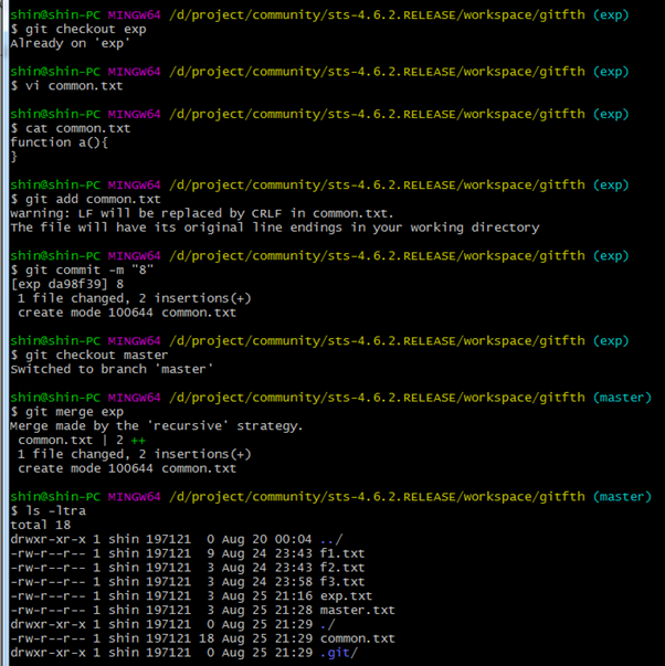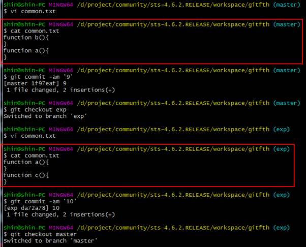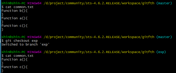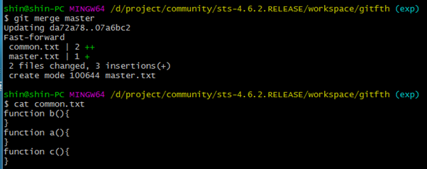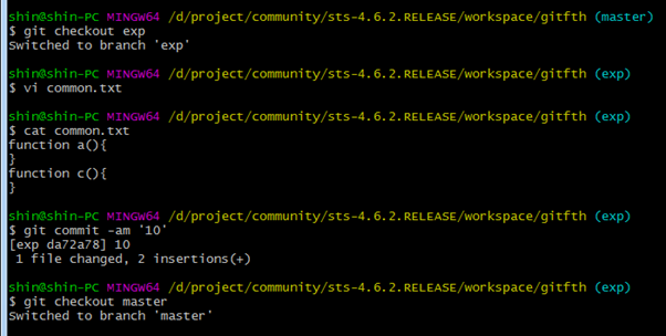 마스터와 exp 브랜치의 소스가 서로 다른 것을 알 수 있다. 왜냐하면 exp소스는 master에 병합했는데, master 소스는 exp로 병합히지 않았기 때문이다.