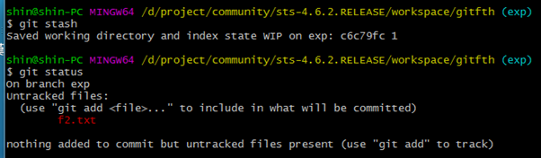 이럴 때 git stash로 임시저장을 해도 f2.txt는 추적되지 않는다고 메시지를 보여준다.