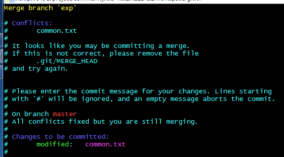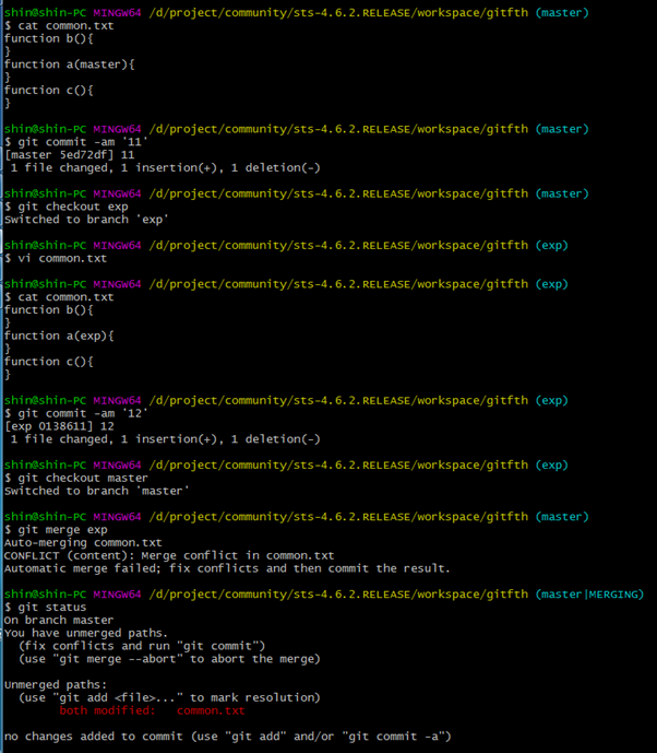 마스터와 exp 브랜치가 common.txt를 서로 다르게 수정해서 커밋했다.