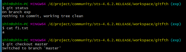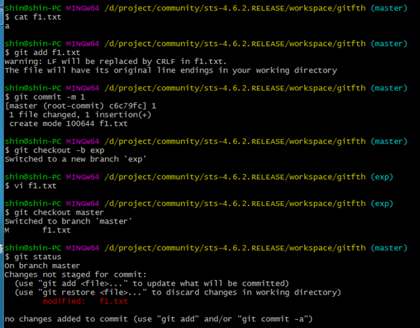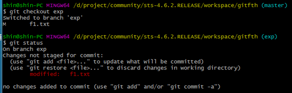 7. status를 찍어보면 exp 브랜치에서 작업한 f1.txt 가 master에 영향을 준다는 메시지