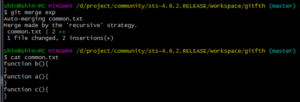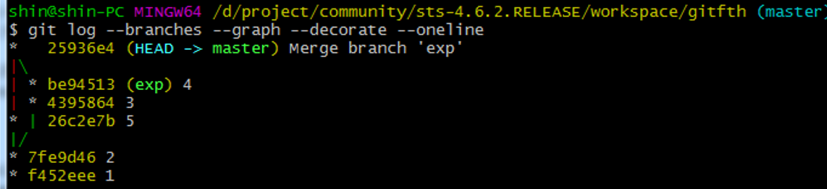 2. Merge branch ‘exp’ : 아까 작성한 디폴트 메시지 > 이것이 master의 최신 커밋
